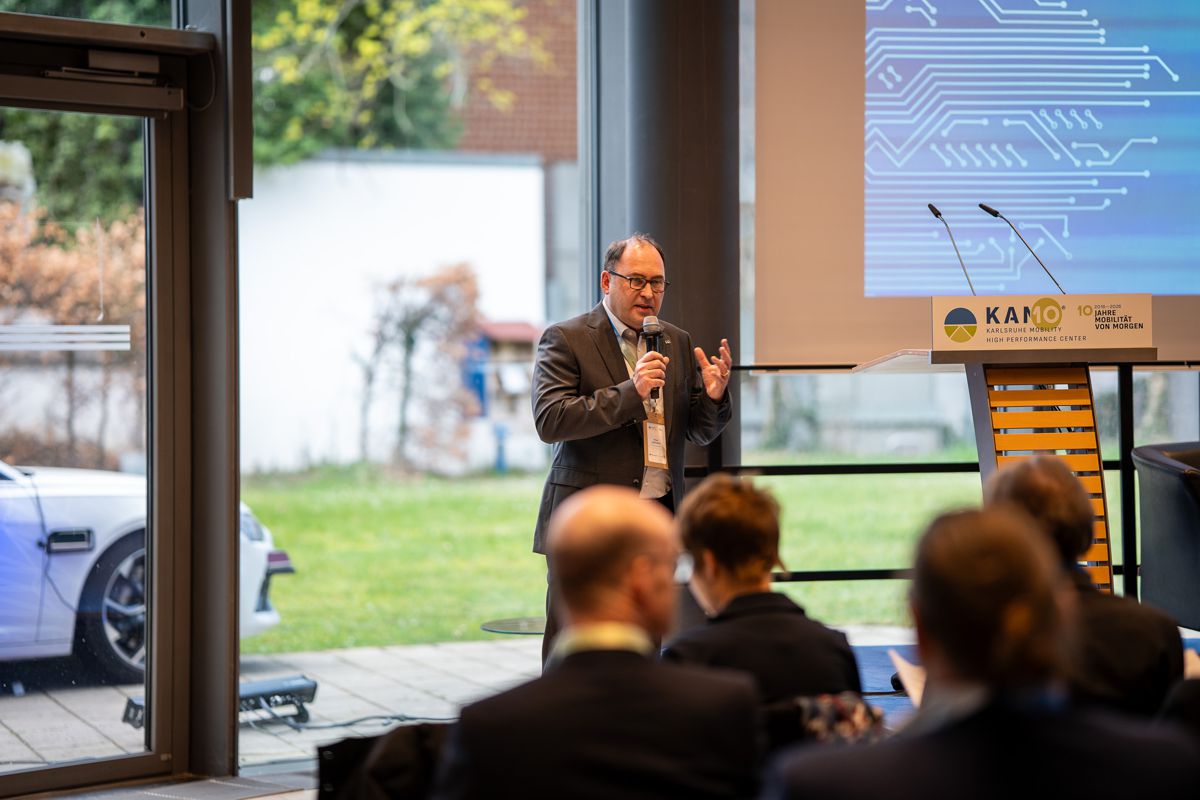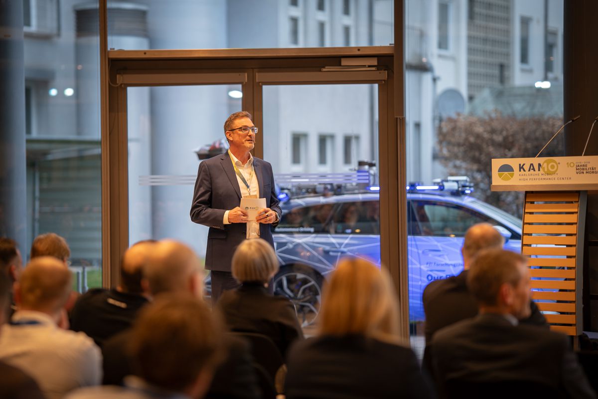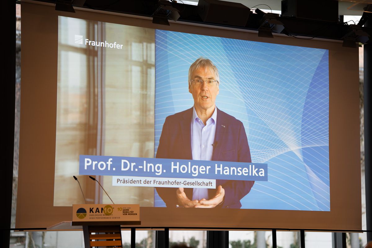 Das nächste Grußwort sprach Fraunhofer-Präsident Holger Hanselka als Videobotschaft. Seine Verpflichtungen an anderem Ort nahm er zum humorigen Anlass, „gleichzeitig an zwei oder drei Stellen zu sein“ als wahrscheinlich unlösbare Herausforderung der Mobilitätsforschung zu postulieren. Allerdings: „Zukunftsweisende Mobilität ist ein Systemthema. Es geht nur zusammen, alleine geht hier gar nichts“, befand Hanselka. Das KAMO-Netzwerk vereine unterschiedliche Kompetenzen unter einem Dach und bringe Erkenntnisse direkt in die Praxis. „Dass das Ökosystem heute noch so besteht, zeigt, wie gut die Idee damals war“, folgerte Hanselka, wies auf die Industrieinvestitionen der zurückliegenden Jahre hin und dankte unter anderem dem Land Baden-Württemberg für dessen Beitrag, „dieses Netzwerk prosperieren zu lassen“.