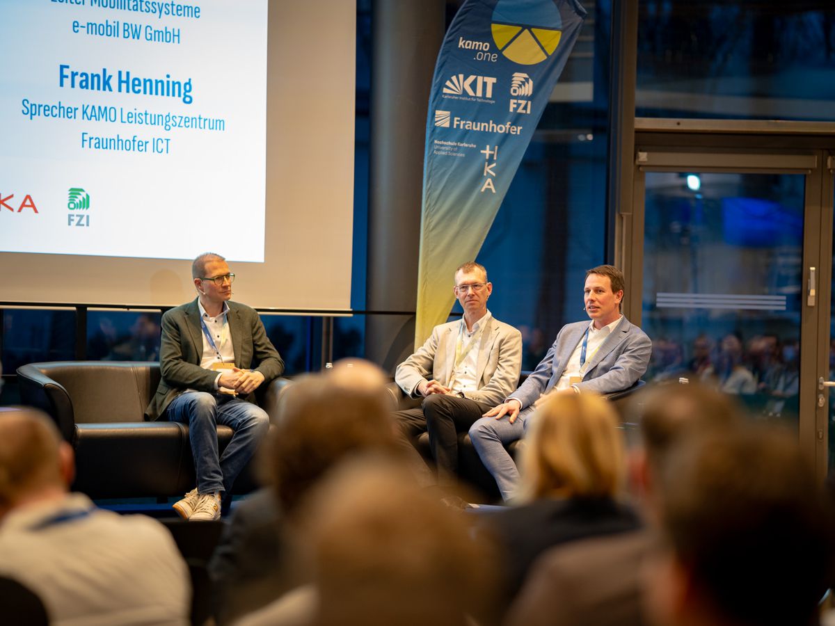 „Ich würde vermuten, dass Sie sich jetzt ausreichend begrüßt fühlen“, moderierte Vortisch weiter und erntete zustimmendes Gelächter. Sein Co-Sprecher des KAMO-Mobilitätszentrums und Leiter des Fraunhofer-Instituts für Chemische Technologie ICT, Frank Henning, bat daraufhin fünf Vertreter der KAMO-Industriepartner in eine Podiumsdiskussion zum Thema „Konzepte, Werkstoffe und Technologien für die Mobilität der Zukunft“: Ralf Frisch (Principal Business Development Manager PTV Group), Jürgen Geschner (CCO init SE), Michael Ruprecht (Leiter Mobilitätssysteme e-mobil BW GmbH), Thiemo Erb (Fachreferent Motorsport Leichtbau, Dr.-Ing. h. c. F. Porsche AG) und Henrik Gommel (Geschäftsführer GOTECH Fahrzeugentwicklungs- und Konstruktionsgesellschaft mbH).