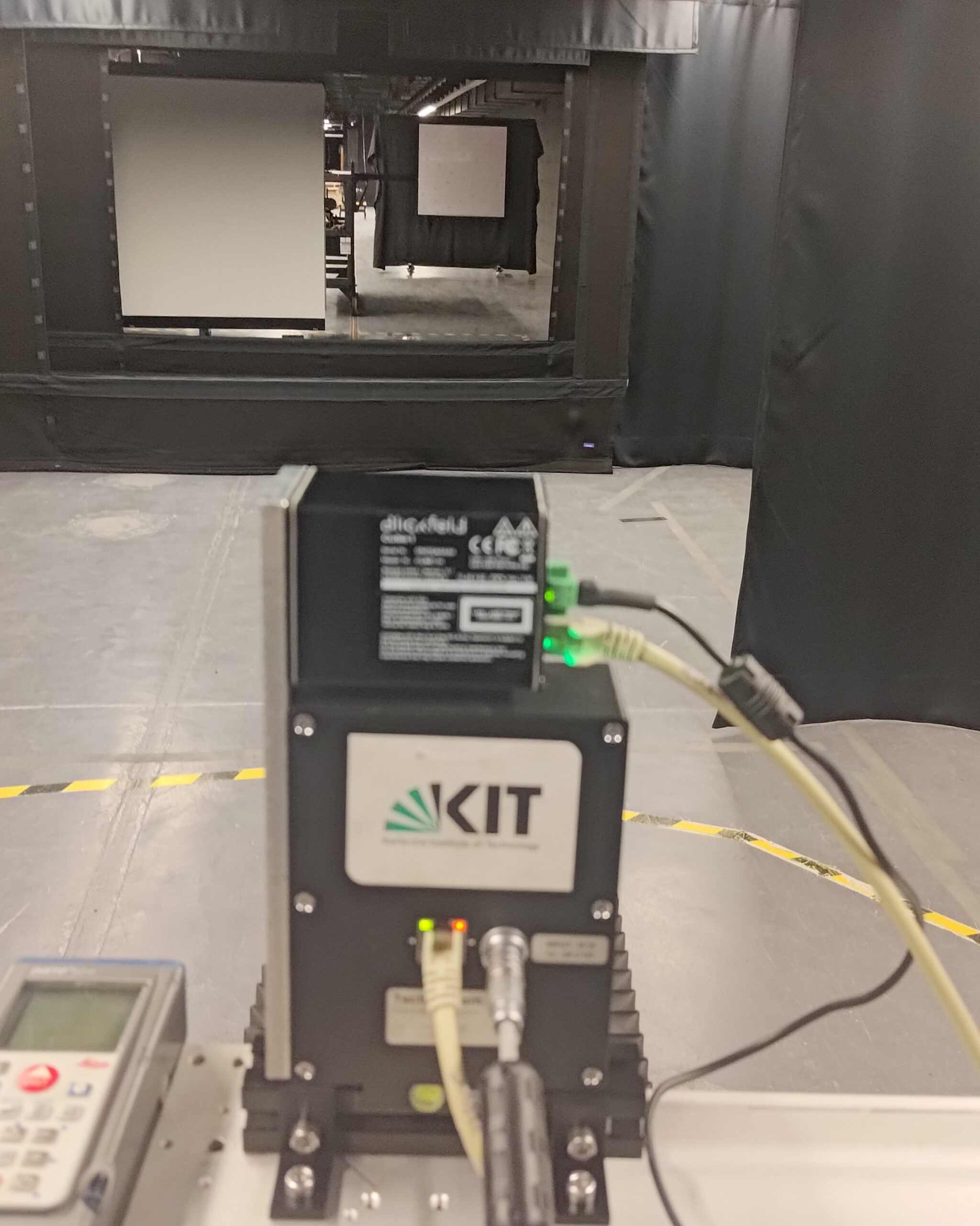 Messung der Strahlstärkeverteilung mit 0,01° Auflösung eines Einzelstrahl-Patterns des Blickfeld Cube im Lichttechnischen Prüflabor des KIT-LTI (© KIT-LTI)